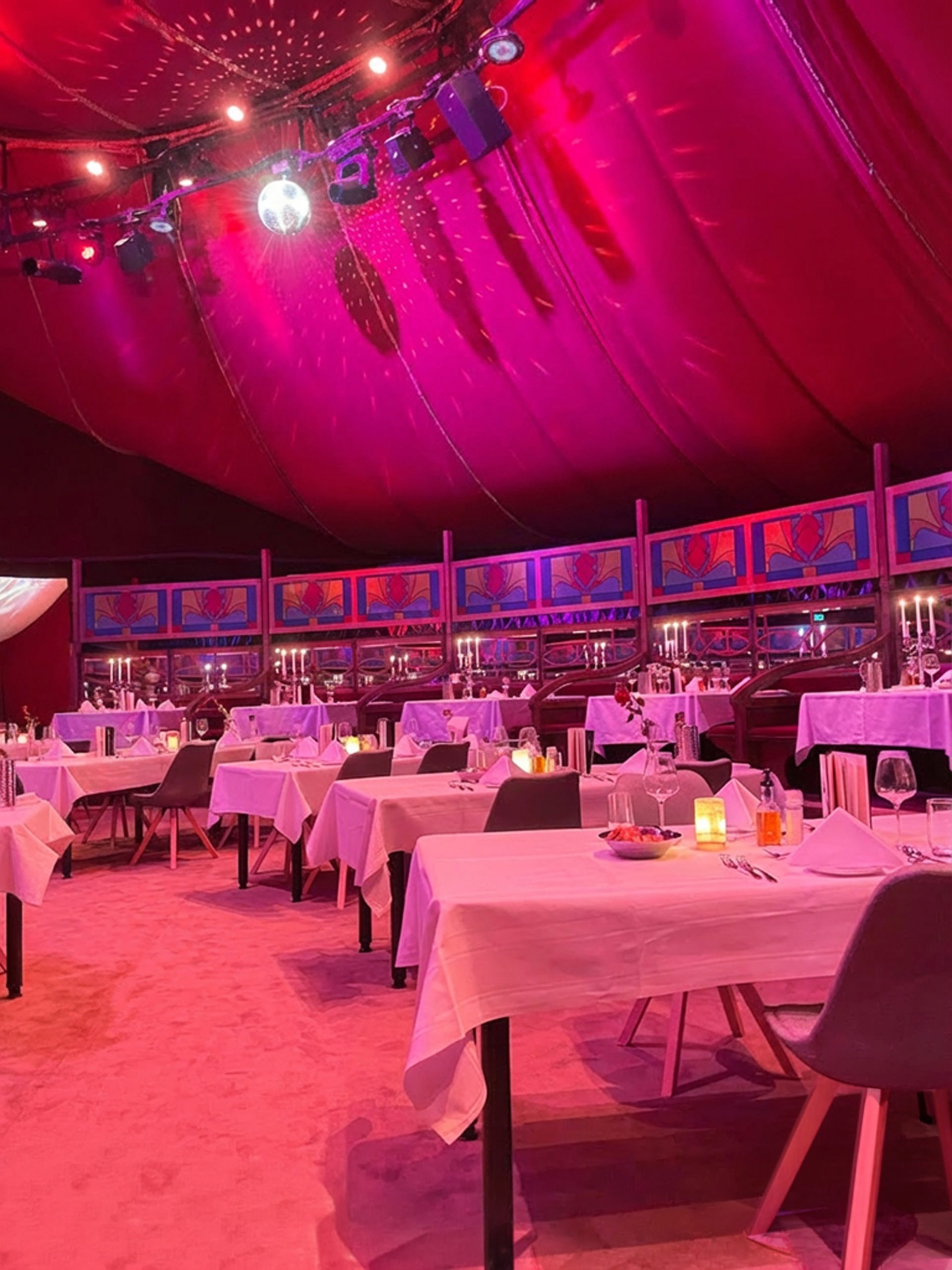 Das Spiegelzelt begeistert mit kunstvoll geschliffenen Spiegeln, schimmernden Farben, edlen Stoffen und stilvollen Sitzecken. Die besondere Architektur schafft eine elegante, atmosphärische Umgebung, die bereits beim Betreten Eindruck hinterlässt.